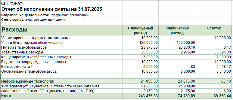 | Членские взносы (август 2025 – июль 2026 гг.) 12 мес. (6 309,2 руб. *35 участков) | 220 822,5 |