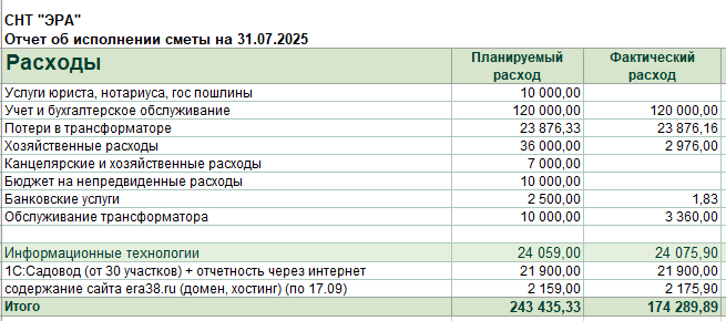 | Членские взносы (август 2024 – июль 2025 гг.) 12 мес. (6 406,2 руб. *38 участков) | 243 435,3 |
