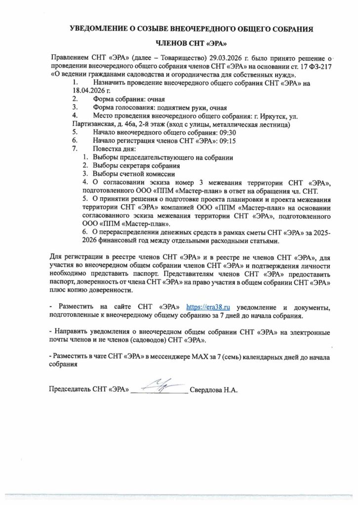 Во исполнение п. 5 внеочередного общего собрания членов СНТ Эра от 15.03.2026г.: